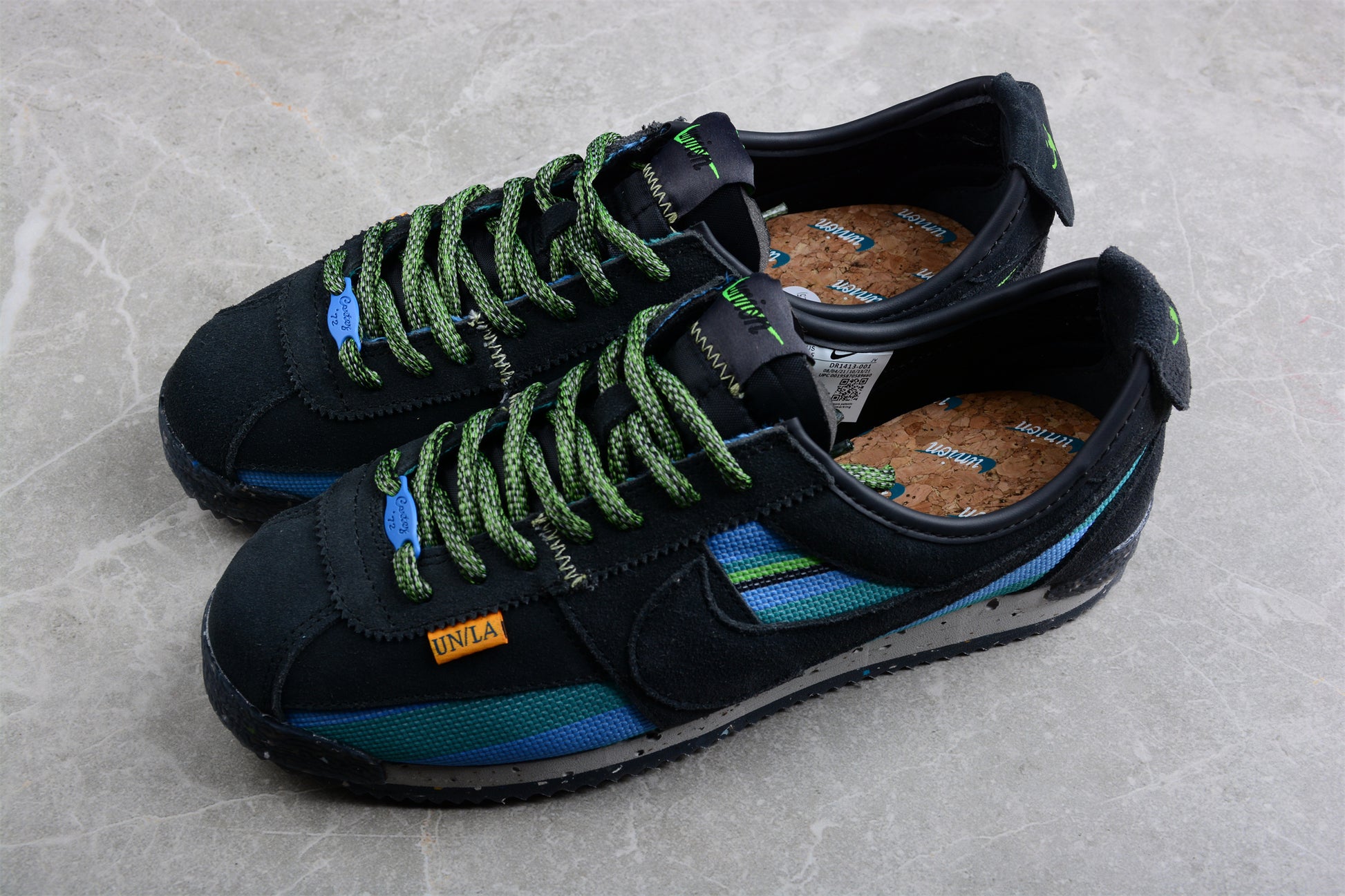 El Nike Cortez x Union LA negro, azul y verde celebra la fusión entre la historia y la innovación. Esta colaboración exclusiva entre Nike y Union Los Ángeles reinterpreta el clásico Cortez con una estética moderna, materiales sostenibles y detalles únicos. Su parte superior combina malla y gamuza en tonos negros con degradados en azul y verde, creando un efecto dinámico y llamativo. La etiqueta UN/LA lateral reafirma su carácter de edición limitada, mientras la mediasuela moteada fabricada con materiales reciclados aporta un toque ecológico. La suela con patrón dentado garantiza tracción y comodidad, ideal para quienes buscan estilo urbano, autenticidad y conciencia ambiental.
