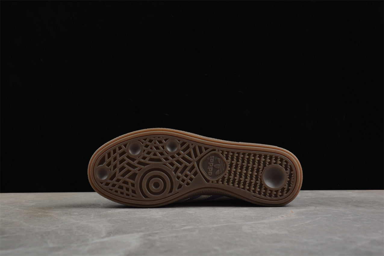 Las zapatillas adidas Handball Spezial morado y blanco combinan el estilo retro de los años 70 con la comodidad moderna inspiradas en el calzado original para jugadores de balonmano presentan una parte superior de ante suave con las icónicas tres bandas en color blanco su suela de goma proporciona una tracción excelente y un agarre estable perfectas para quienes buscan un look urbano con esencia deportiva su diseño clásico se adapta fácilmente a cualquier conjunto aportando autenticidad y estilo en cada paso.